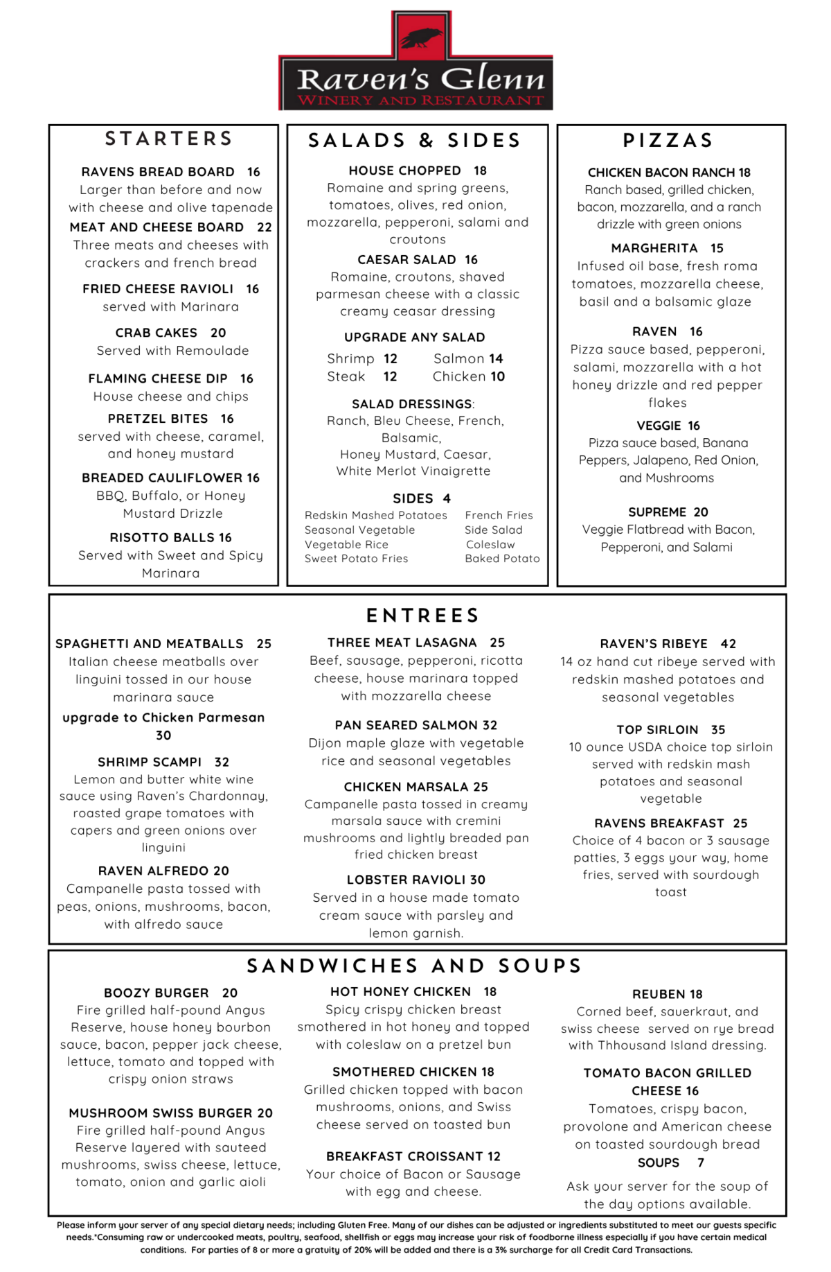 At Raven's Glenn, the main menu offers an exquisite selection designed for discerning palates. Indulge in succulent steaks, fresh fish, and delightful pasta dishes. The flatbreads and sandwiches elevate local dining, making it a standout choice among high-end restaurants in West Lafayette. We invite you to explore our food at one of the best wineries in Ohio.